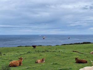 Ich dachte ich bin im Allgäu. Kühe, Schafe und Ziegen weiden auf Steilhangwiesen, ein paar Bauernhöfe, einige luxuriöse Ferienhausvillen….und am Fuße des „Allgäu“ dümpeln die mehr oder weniger luxuriösen Yachten in der Atlantikdünung.
